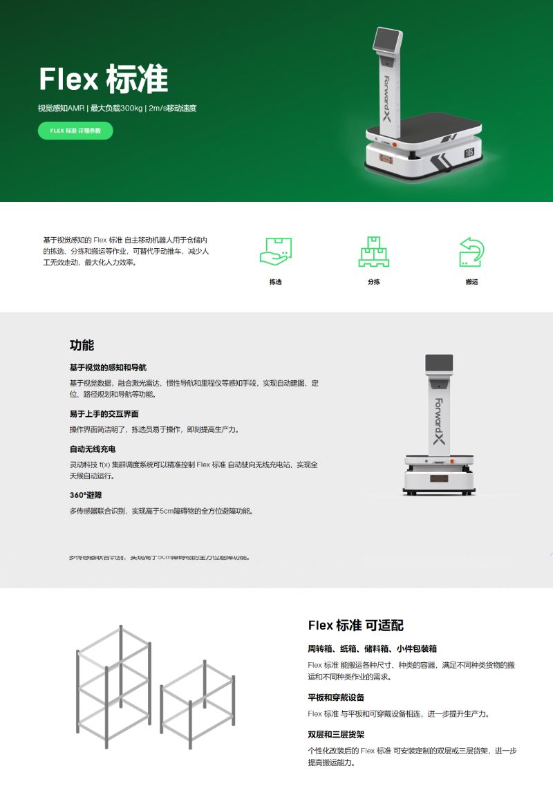 基于視覺感知的 Flex 標(biāo)準(zhǔn) 自主移動機(jī)器人用于倉儲內(nèi)的揀選、分揀和搬運(yùn)等作業(yè),可替代手動推車,減少人工無效走動,最大化人力效率。