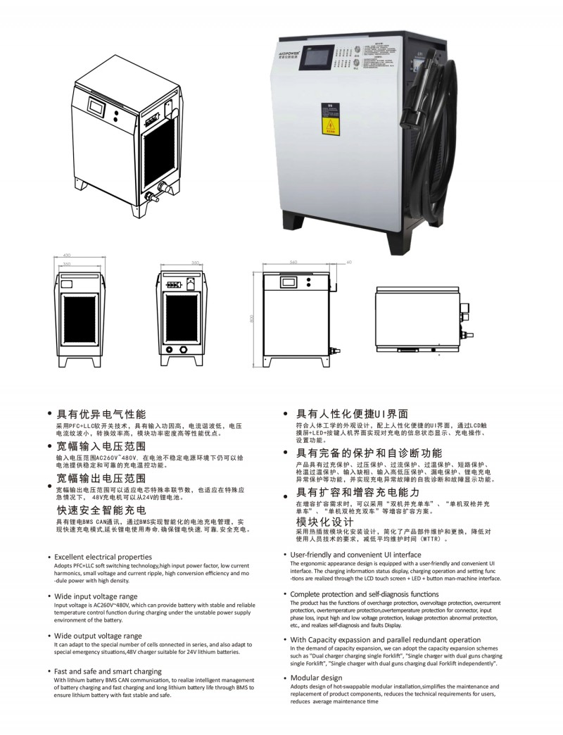 觸摸屏智能操作設(shè)計(jì):告別傳統(tǒng)按鍵方式,給您帶來更現(xiàn)代更具科技智能的操作體驗(yàn) 自動充電:插槍自動充電,簡化充電流程,便于操作 兼容性高:80V200A兼容48V200A充電 多重保護(hù): 輸出短路,過流過壓保護(hù),反接保護(hù),電流導(dǎo)管保護(hù)等多重保護(hù) 預(yù)約充電功能:避開高峰用電時(shí)段,有效節(jié)省成本 雙語切換:中英文雙語隨需切換,跨越語言障礙,與世界接軌 人性化設(shè)計(jì):充電機(jī)背板內(nèi)部附部件明細(xì)及產(chǎn)品接線圖,方便客戶可更清楚的了解產(chǎn)品,便于維修,提高售后時(shí)效 獨(dú)特設(shè)計(jì): 內(nèi)置電磁鎖驅(qū)動模塊,防止臨時(shí)斷電鎖槍 使用壽命更長:功率模塊預(yù)留20%空間,提高模塊的使用壽命 出色內(nèi)部結(jié)構(gòu): 內(nèi)部結(jié)構(gòu)左右出風(fēng),內(nèi)部電路不容易積粉塵,提高充電機(jī)壽命