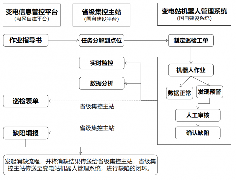 國自智能巡視解決方案使“變電信息管控平臺業(yè)務流”、“省級集控主站業(yè)務流”、“變電站機器人管理系統(tǒng)業(yè)務流”三條業(yè)務流實現閉環(huán),三個系統(tǒng)均可派發(fā)巡檢任務使機器人精準作業(yè),及時將數據回傳至省級集控主站及變電信息管控平臺,系統(tǒng)互通互聯(lián),打通上下數據流,變電站整體巡檢效率、巡檢精度、變電站信息化水平顯著提升。