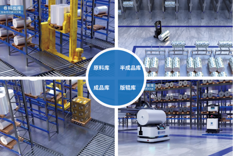 針對(duì)以上痛點(diǎn),藍(lán)芯科技以智能拆包裝置、打橫裝置、上下料機(jī)器人、無(wú)人叉車、搬運(yùn)機(jī)器人、分切下料打包自動(dòng)線為主體,結(jié)合智能倉(cāng)儲(chǔ)設(shè)備、信息化管理系統(tǒng),實(shí)現(xiàn)包裝企業(yè)來(lái)料自動(dòng)拆包、物料自主搬運(yùn)、卷料自動(dòng)上/下料、庫(kù)位自動(dòng)識(shí)別、成品/半成品/原料自動(dòng)出入庫(kù)作業(yè)。