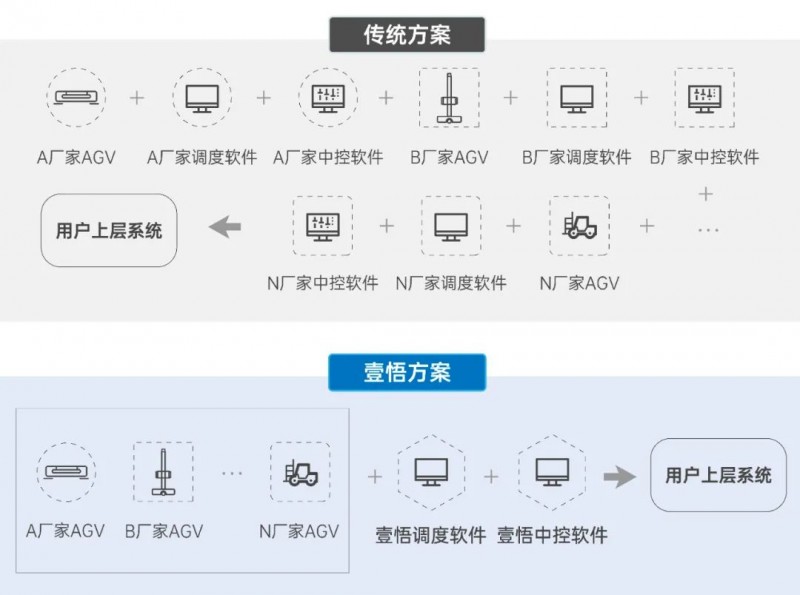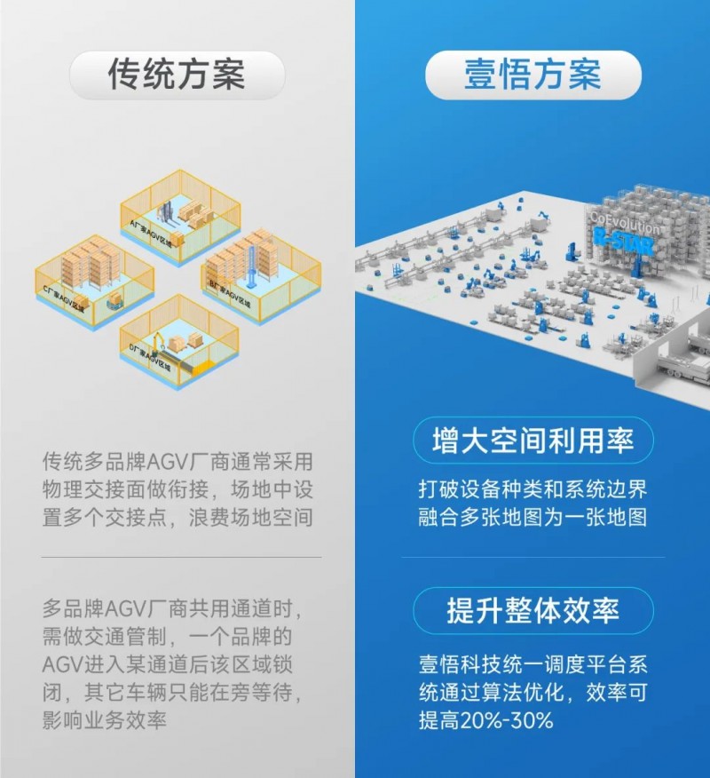 同等作業(yè)效率下,壹悟科技星羅自動(dòng)化工廠解決方案,不僅可以輕松實(shí)現(xiàn)“一套系統(tǒng)調(diào)度全場”,大幅降低改造成本與對接工作量,還可以通過軟件靈活配置和修改流程,快速適應(yīng)業(yè)務(wù)變化。