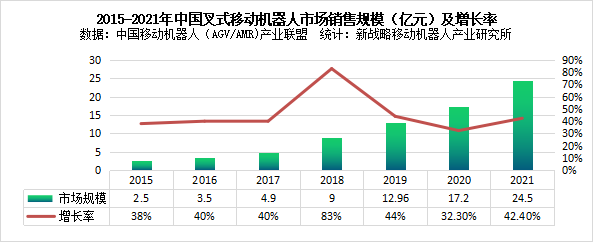 據中國移動機器人(AGV/AMR)產業聯盟數據、新戰略移動機器人產業研究所統計,2021年中國叉式移動機器人(含視覺導航)銷量達8000臺,同比增長60%,市場規模約為24.5億元,同比增長42.40%。