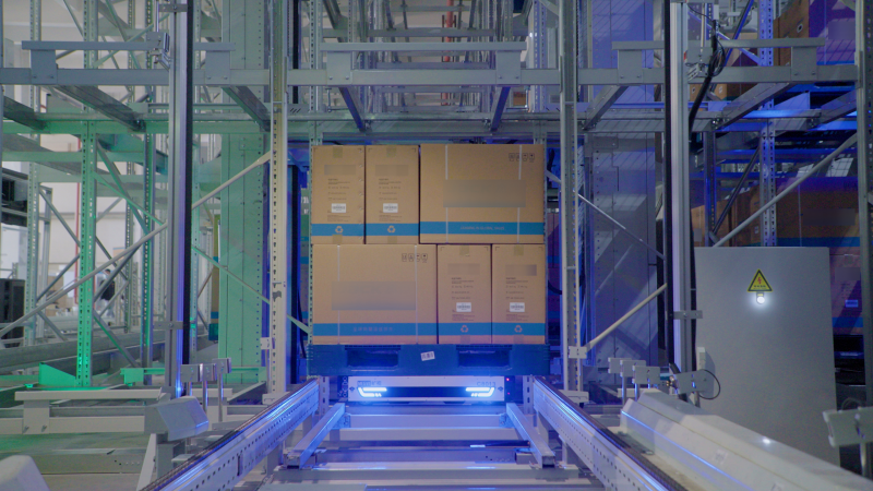 運行于縫紉機成品“智能密集庫”中的曠視四向穿梭車