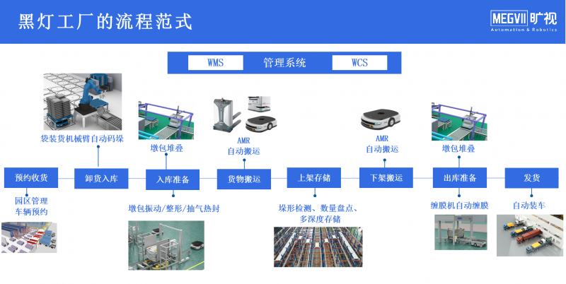 作為深耕行業(yè)的新一代智慧物流服務(wù)提供商,曠視打造了一套面向“黑燈工廠”物流倉(cāng)儲(chǔ)部分升級(jí)的流程范式,實(shí)現(xiàn)從預(yù)約收貨到卸貨入庫(kù)、入庫(kù)準(zhǔn)備、貨物搬運(yùn)、上架存儲(chǔ)、下架搬運(yùn)、出庫(kù)準(zhǔn)備、發(fā)貨的全流程智能化、自動(dòng)化、無(wú)人化。