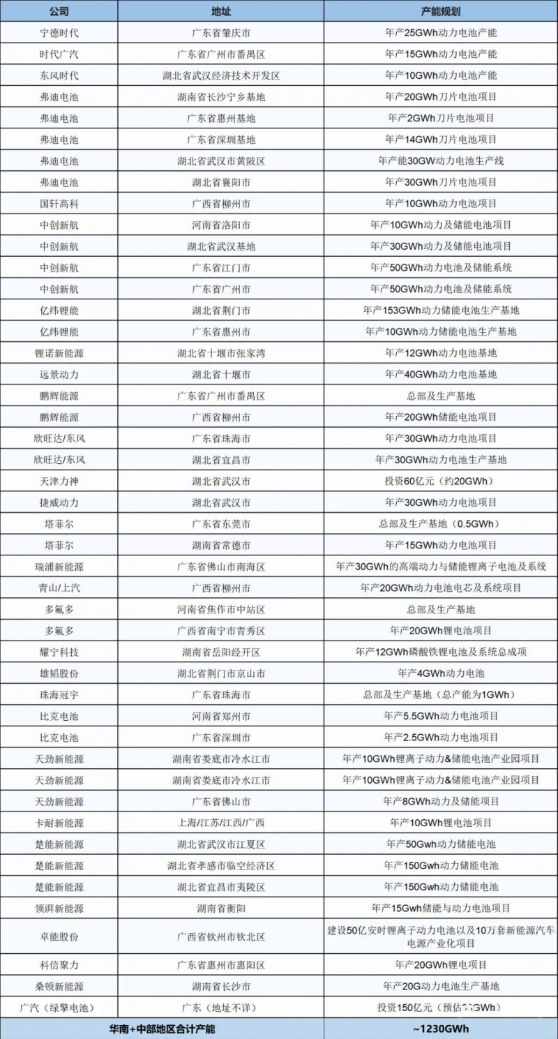 全國(guó)動(dòng)力與儲(chǔ)能電池基地產(chǎn)能統(tǒng)計(jì)表3---華南+中部地區(qū)