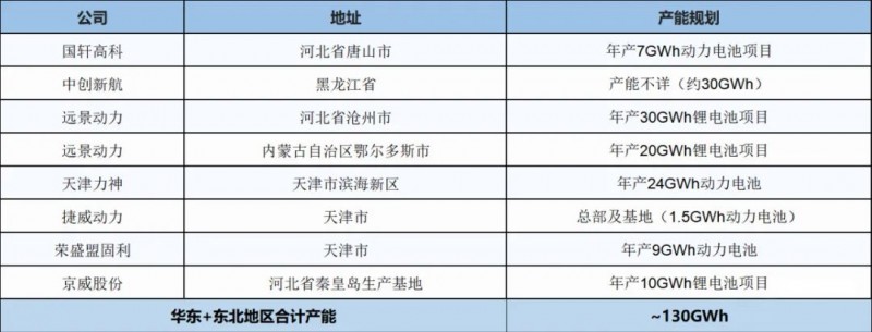 全國(guó)動(dòng)力與儲(chǔ)能電池基地產(chǎn)能統(tǒng)計(jì)表2---華北+東北地區(qū)