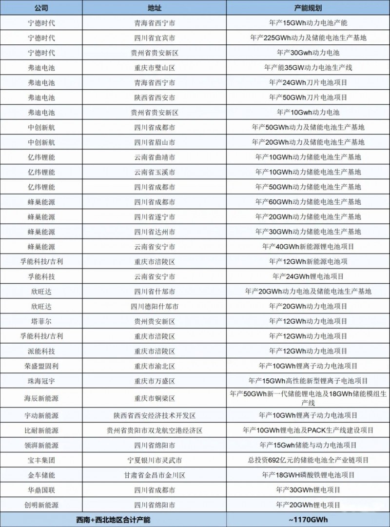 全國(guó)動(dòng)力與儲(chǔ)能電池基地產(chǎn)能統(tǒng)計(jì)表4---西南+西北地區(qū)