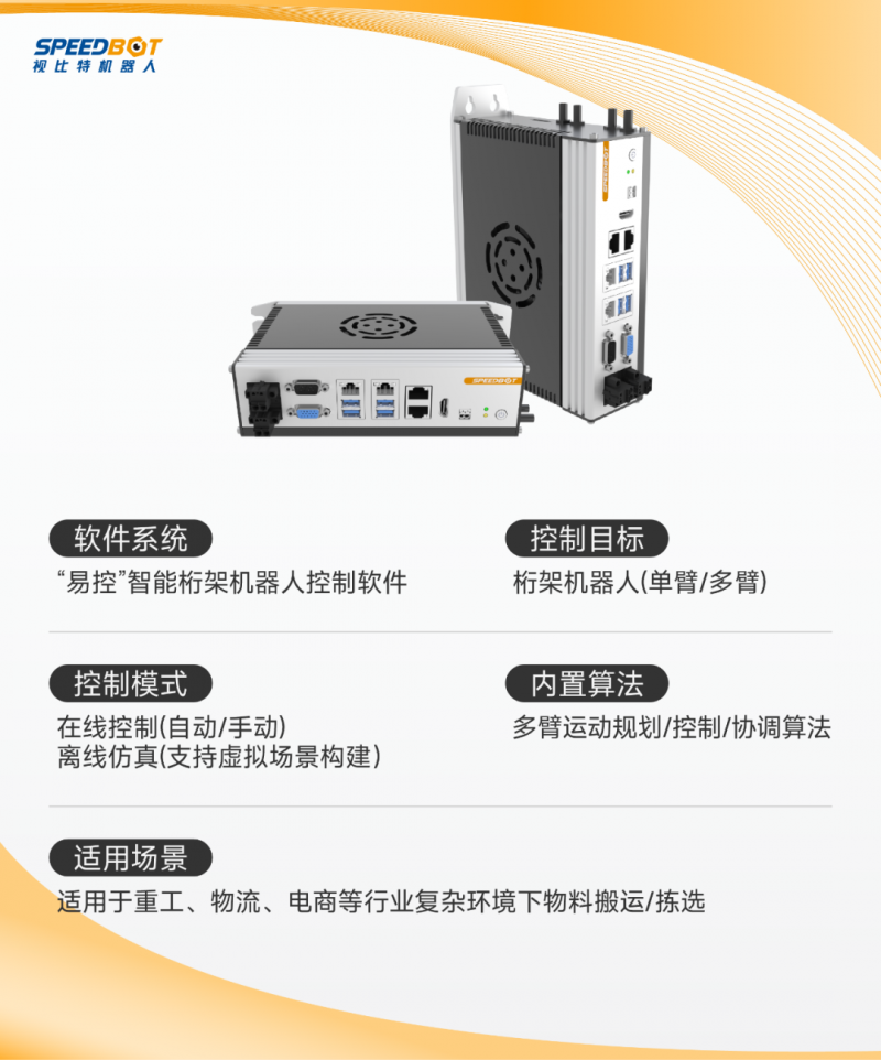 SpeedTruss智能桁架控制器主要用于多臂共軸桁架機器人(N≥1)的運動控制,運用自主研發(fā)的桁架運動規(guī)劃、多臂協(xié)同運動控制、無碰運動協(xié)調(diào)等算法技術(shù),為智能產(chǎn)線提供靈活、精準(zhǔn)、高效的多臂桁架運動控制方案。用戶只需調(diào)用控制器提供的高級任務(wù)指令接口(如將某臺桁架臂移動到目標(biāo)位置K),即可實現(xiàn)對桁架機器人運動軌跡的自動控制與協(xié)調(diào),保障各個桁架臂高效無碰協(xié)同運動,有效提升生產(chǎn)效率。