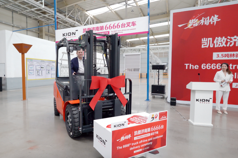 在萬眾矚目中,凱傲集團首席執(zhí)行官Rob Smith駕駛著第6666臺林德3.5噸電動平衡重叉車重磅亮相,并將代表“能量和成功”寓意的叉車鑰匙交付于海爾代表,開啟雙方下一階段的深入合作。