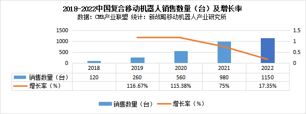 圖表:2018-2022中國復(fù)合移動(dòng)機(jī)器人銷售數(shù)量(臺(tái))及增長率