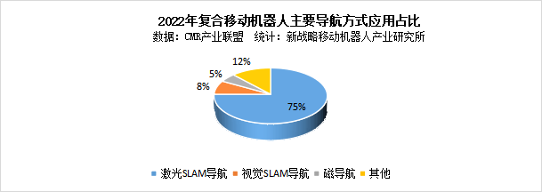 按照導(dǎo)航方式分,2022年,以激光SLAM為主的自然導(dǎo)航復(fù)合移動(dòng)機(jī)器人是依舊應(yīng)用主流,占比為75%,主要原因在于,復(fù)合移動(dòng)機(jī)器人應(yīng)用的主要領(lǐng)域,半導(dǎo)體、3C以及巡檢都對(duì)機(jī)器人的柔性化要求較高,因此,基于激光SLAM的自然導(dǎo)航應(yīng)用較多;視覺導(dǎo)航應(yīng)用比例為8%,相對(duì)激光SLAM來說,視覺SLAM由于起步晚,成熟度稍有欠缺,不過也出現(xiàn)了一些比較優(yōu)秀的企業(yè),如藍(lán)芯科技等。其次,在一些工位移動(dòng)路線比較固定的場景,磁導(dǎo)復(fù)合移動(dòng)機(jī)器人也有一些應(yīng)用,占比為5%。
