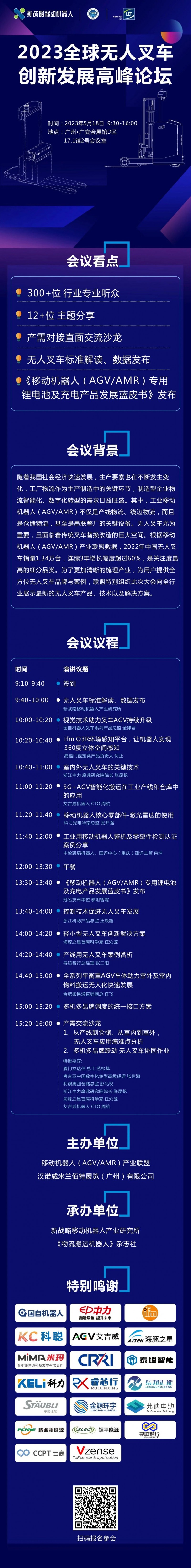2023全球無人叉車創(chuàng)新發(fā)展高峰論壇”將在廣州重磅開啟,會議上,除14+主題演講外,還將重磅發(fā)布《移動機器人(AGV/AMR)專用鋰電池及充電產(chǎn)品發(fā)展藍皮書(2023版)》,敬請期待!