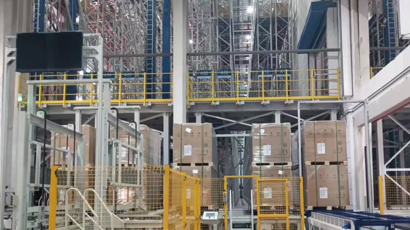 立庫占地1.8萬平米,配備14000多個托盤貨位,能夠存儲27000多箱貨品。在該項目中,曠視機(jī)器人通過智慧物流軟件平臺“曠視河圖”,集成15臺高20多米單元載荷3噸的雙立柱雙深位堆垛機(jī)、450余臺輸送機(jī),以及若干疊托機(jī)、打帶機(jī)、RGV等核心設(shè)備,實(shí)現(xiàn)從成品光伏組件下線后的自動供給母托盤、合托、打帶入庫,以及成品發(fā)貨出庫,并兼容反向物流。