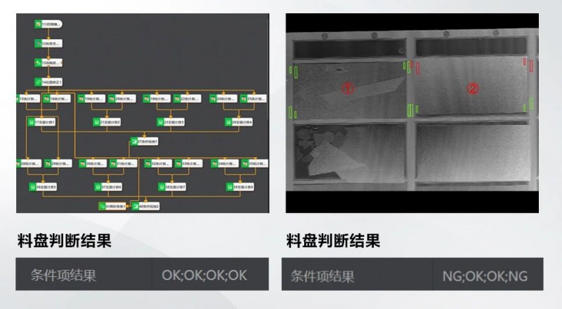 針對搭邊缺陷檢測,基于相機采集的深度圖像,導入VM 3D軟件中,依據mark點定位到每個料盤的四個角點,分別在角點料坑上下曲小區域計算均值,可取四對或八對區域,比對料坑上下高度差值,正值為OK(綠色非搭邊框),負值為NG(紅色搭邊框)。