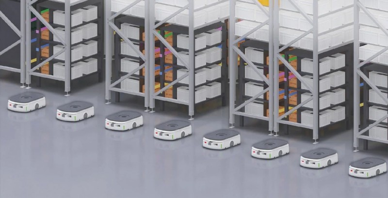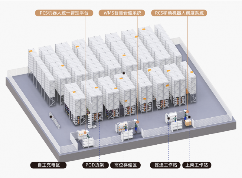 下揀:使用潛伏式AGV+POD料架的形式來實現(xiàn)揀選物料的快速出入庫和預(yù)分揀暫存,充分發(fā)揮潛伏式AGV快速靈活的搬運特點,實現(xiàn)從高位倉庫到揀選位/出入庫站點的接駁搬運。