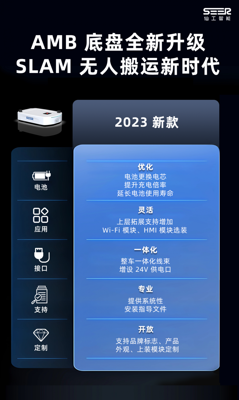 基于對(duì)客戶(hù)市場(chǎng)的深度分析和技術(shù)研發(fā)的長(zhǎng)期積累,仙工智能在今年再次完成 AMB 底盤(pán)多個(gè)層面的優(yōu)化升級(jí)。