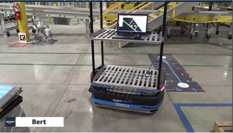 其中值得注意的是,區(qū)別于kiva需要依靠二維碼實現(xiàn)路徑導引,Bert通過搭載更多的傳感器,感知能力進一步提升,亞馬遜希望有了Bert,機器人不再需要局限于限制區(qū)域,同時,機器人可以更好地與員工協(xié)作。但后續(xù)未見Bert在亞馬遜內部落地應用。