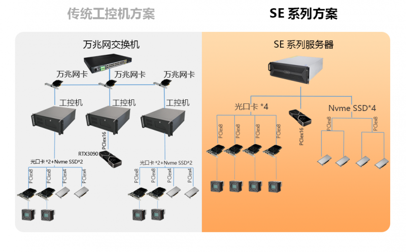 SE系列布置簡(jiǎn)單、靈活,調(diào)試更便捷;一臺(tái)設(shè)備集多卡擴(kuò)展、高速處理、高速存儲(chǔ)3合1,更省空間;搭配專業(yè)PCIe接口存儲(chǔ)設(shè)備,輕松實(shí)現(xiàn)高速存圖需求。