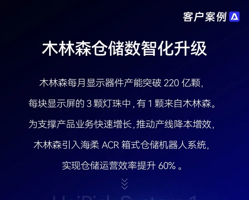 為加強木林森各業(yè)務(wù)端的智能化和柔性化水平,公司引進(jìn)了海柔創(chuàng)新HaiPick System 1,通過以ACR為核心的多種自動化設(shè)備,實現(xiàn)產(chǎn)線成品的一體化智能拆垛、自動化出入庫、包裝、碼垛。