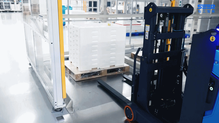 智能叉車可用于搬運(yùn)、堆垛、舉升貨物,在該車間內(nèi)用于貨物跨區(qū)轉(zhuǎn)運(yùn)。