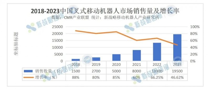 據(jù)CMR產(chǎn)業(yè)聯(lián)盟數(shù)據(jù)、新戰(zhàn)略移動(dòng)機(jī)器人產(chǎn)業(yè)研究所統(tǒng)計(jì),2023年中國(guó)叉式移動(dòng)機(jī)器人銷量達(dá)19500臺(tái),同比增長(zhǎng)46.62%。