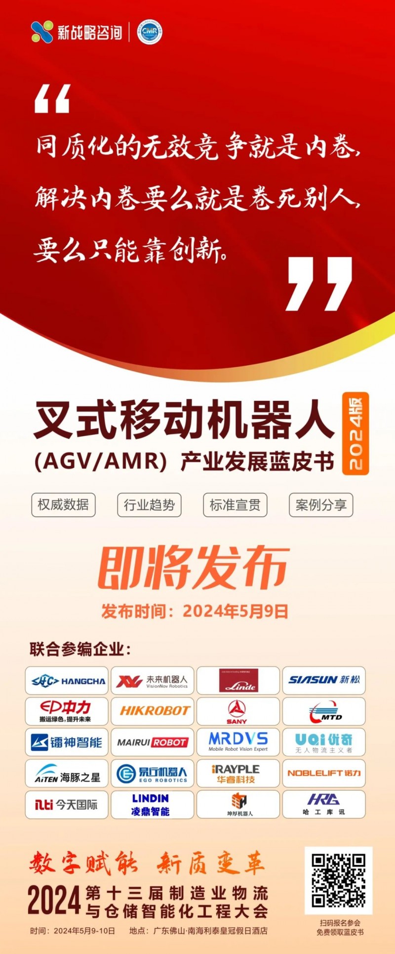 2024年,為了更好地探析當(dāng)前無(wú)人叉車市場(chǎng)最新發(fā)展情況及趨勢(shì),推動(dòng)無(wú)人叉車深入應(yīng)用,彰顯行業(yè)品牌力量,由CMR產(chǎn)業(yè)聯(lián)盟主編,杭叉智能、未來(lái)機(jī)器人、林德、新松、浙江中力、海康機(jī)器人、三一機(jī)器人、機(jī)科股份、鐳神智能、邁睿機(jī)器人、邁爾微視、UQI優(yōu)奇、海豚之星、易行機(jī)器人、華睿科技、上海諾力智能、今天國(guó)際、凌鼎智能、坤厚智能、哈工庫(kù)訊等20家無(wú)人叉車主流企業(yè)聯(lián)合編制的《叉式移動(dòng)機(jī)器人(AGV/AMR)產(chǎn)業(yè)發(fā)展藍(lán)皮書(2024版)》將在5月9日舉辦的“inktype="text" imgurl="" imgdata="null" data-itemshowtype="0" tab="innerlink" data-linktype="2" hasload="1">第十三屆制造業(yè)物流與倉(cāng)儲(chǔ)智能化工程大會(huì)暨第二屆全球叉式移動(dòng)機(jī)器人峰會(huì)”上正式發(fā)布,參會(huì)人員可現(xiàn)場(chǎng)領(lǐng)取藍(lán)皮書紙質(zhì)版一份,敬請(qǐng)期待!