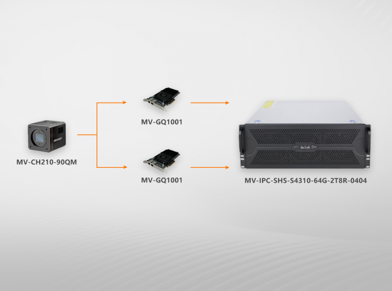 方案采用CH系列2100W分辨率/540幀面陣相機,通過2張50G單口光口卡GQ1001,將所有原圖數據同步傳輸至14GB/s連續寫入性能,16TB容量的SHS系列高速讀寫服務器中。