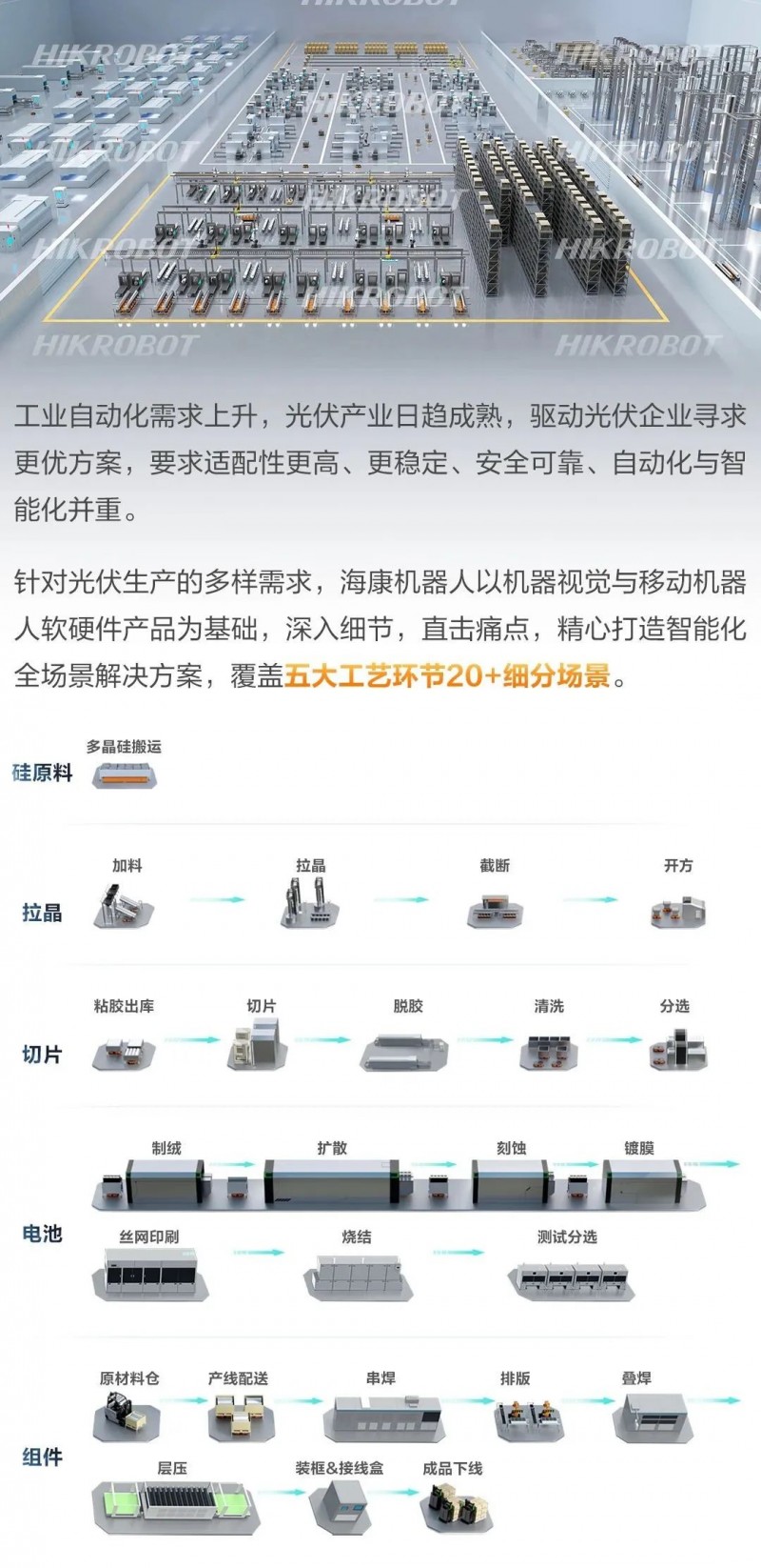 目前海康機(jī)器人已與包括通威、隆基、晶科在內(nèi)的多家光伏頭部企業(yè)在智能制造方面進(jìn)行合作。智能化全場景解決方案在諸多光伏項(xiàng)目中落地應(yīng)用。