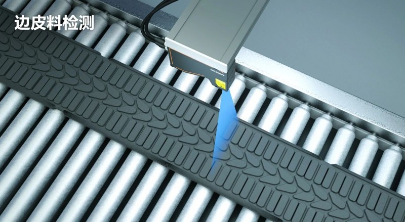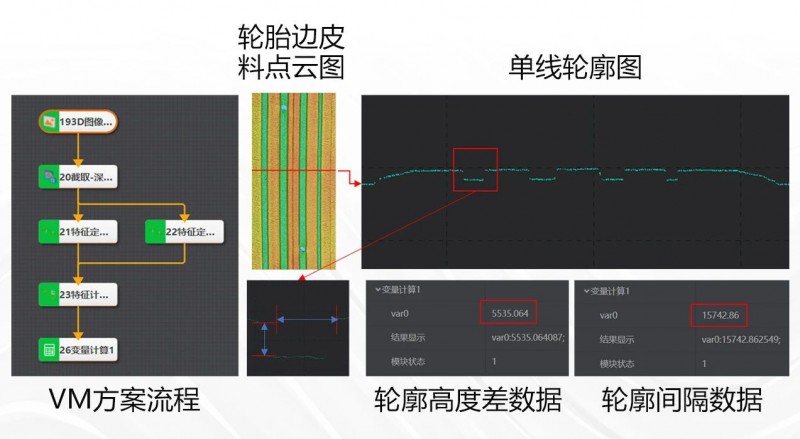 通過3D激光輪廓傳感器掃描輪胎正面、VM搭建方案實時測量輪胎單點高度值變化,當高度值變化低于一定的閾值時,認為輪胎是圓形的,當高度值變化高于一定的閾值時,認為輪胎不圓,此時剔除不良品。