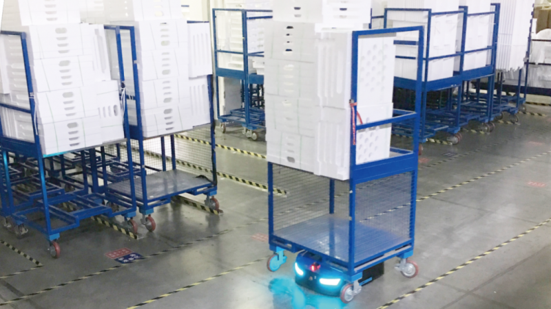某物流機器人企業,在一高端智能物流戰略項目中,牧星為其定制了與該項目匹配的包材存儲與供料上線SLAM車型,大大節省了人力成本。