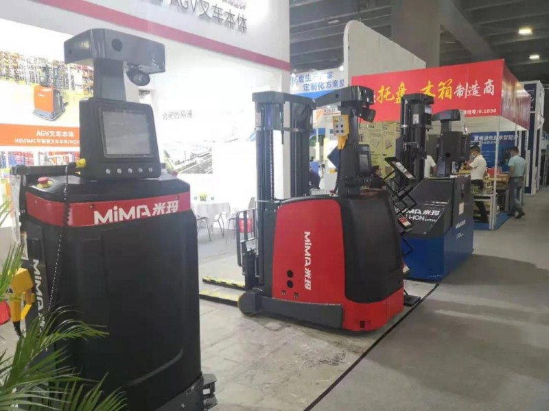 搬易通此次展示了三款AGV專用車體——SLIM超窄通道堆垛車、室內平衡重堆垛車及全向叉車。
