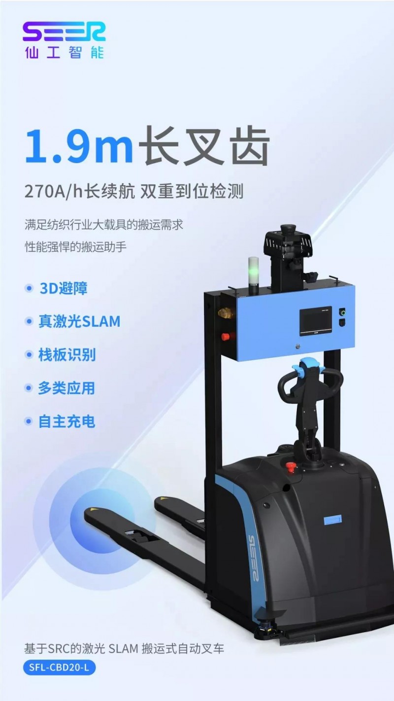 在SFL-CBD20-S的基礎上,仙工智能升級打造了一款紡織行業專用大載具激光SLAM自動叉車——SFL-CBD20-L,該款產品具有長叉齒、長續航的特性,加配雙重到位開關,能夠輕松解決紡織行業物料車裝載不規則的搬運難題,一次性滿足大載具搬運需求。