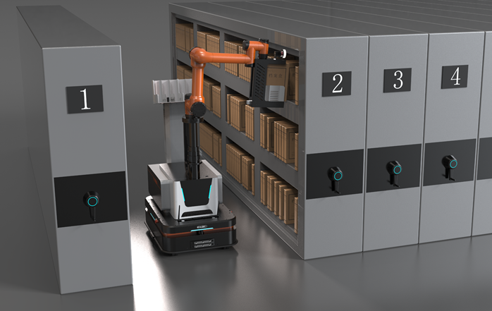 檔案存取機(jī)器人實(shí)現(xiàn)與智能檔案選層回轉(zhuǎn)柜的完美對(duì)接,接收業(yè)務(wù)系統(tǒng)下發(fā)的檔案信息,自動(dòng)協(xié)調(diào)對(duì)應(yīng)的密集架開合,自主移動(dòng)到對(duì)應(yīng)的檔案前,通過視覺識(shí)別檔案特征計(jì)算高精度檔案位置信息,控制機(jī)械臂移動(dòng)到檔案前,實(shí)現(xiàn)檔案上下架作業(yè)。擁有一鍵式操作存取、指定區(qū)域一鍵盤點(diǎn)、智能計(jì)劃任務(wù)等功能,實(shí)現(xiàn)大型檔案庫房的資料自動(dòng)存取。