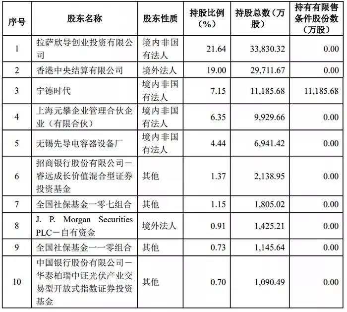 近期,先導(dǎo)智能發(fā)布向特定對象發(fā)行股票發(fā)行情況報告書,截至2021年6月10日,先導(dǎo)智能此次發(fā)行股票總數(shù)量為111,856,823股,發(fā)行價格為22.35元/股,實際募集資金總額約人民幣25億元,扣除發(fā)行費用(不含稅)后,實際募集資金凈額約人民幣24.88億元。此次發(fā)行股份的對象為寧德時代,此次發(fā)行后公司前十名股東情況如下表,寧德時代位列前十大股東。