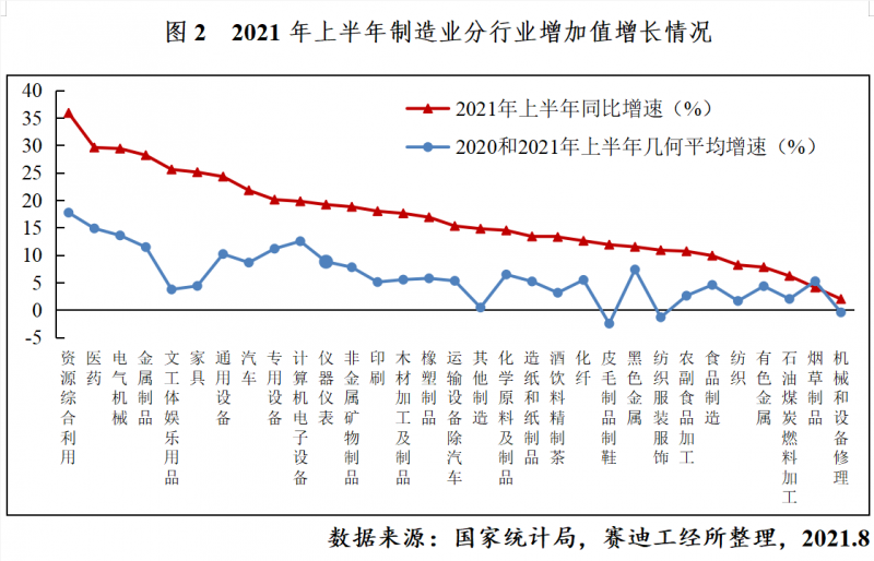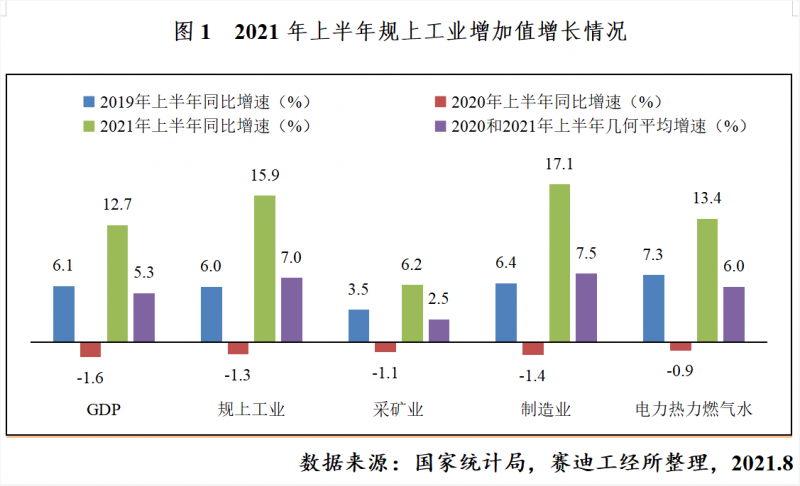 從整體看,2021年上半年工業(yè)生產(chǎn)呈恢復(fù)性增長態(tài)勢。上半年,工業(yè)增加值同比增長15.9%,增速較上年同期加快17.2個(gè)百分點(diǎn);兩年平均增長7.0%,平均增速較2019年同期加快1個(gè)百分點(diǎn),達(dá)2015年以來同期最高水平。