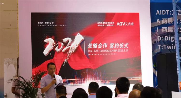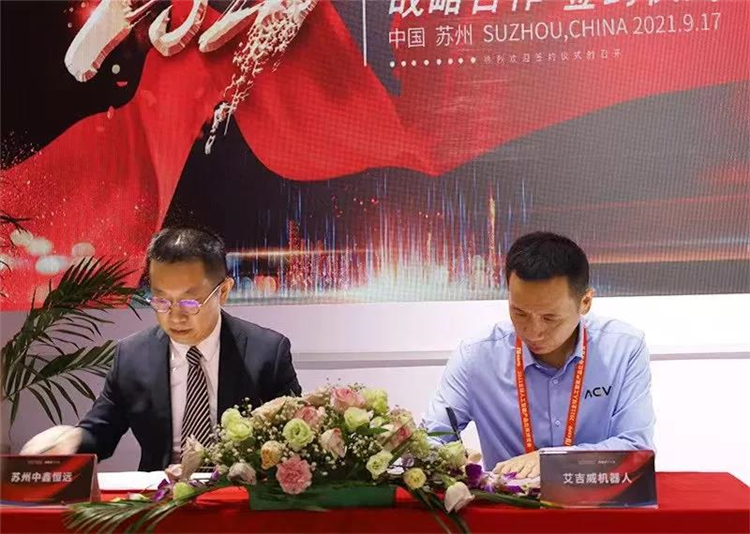 9月17日,蘇州艾吉威機器人有限公司(以下簡稱“艾吉威”)在2021全球人工智能產品應用博覽會現場完成新一輪融資簽約。在蘇州政府領導、企業合作伙伴、各行業精英代表及知名媒體的共同見證下,本輪投資方華鑫證券與中鑫資本代表孔勇軍先生、官子安先生,艾吉威機器人創始人劉勝明先生、聯合創始人司秀芬博士出席簽約儀式并鑒約。