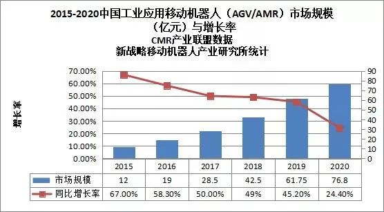 圖:2015-2020中國工業(yè)應(yīng)用移動機(jī)器人(AGV/AMR)市場新增量(臺)與增長率
